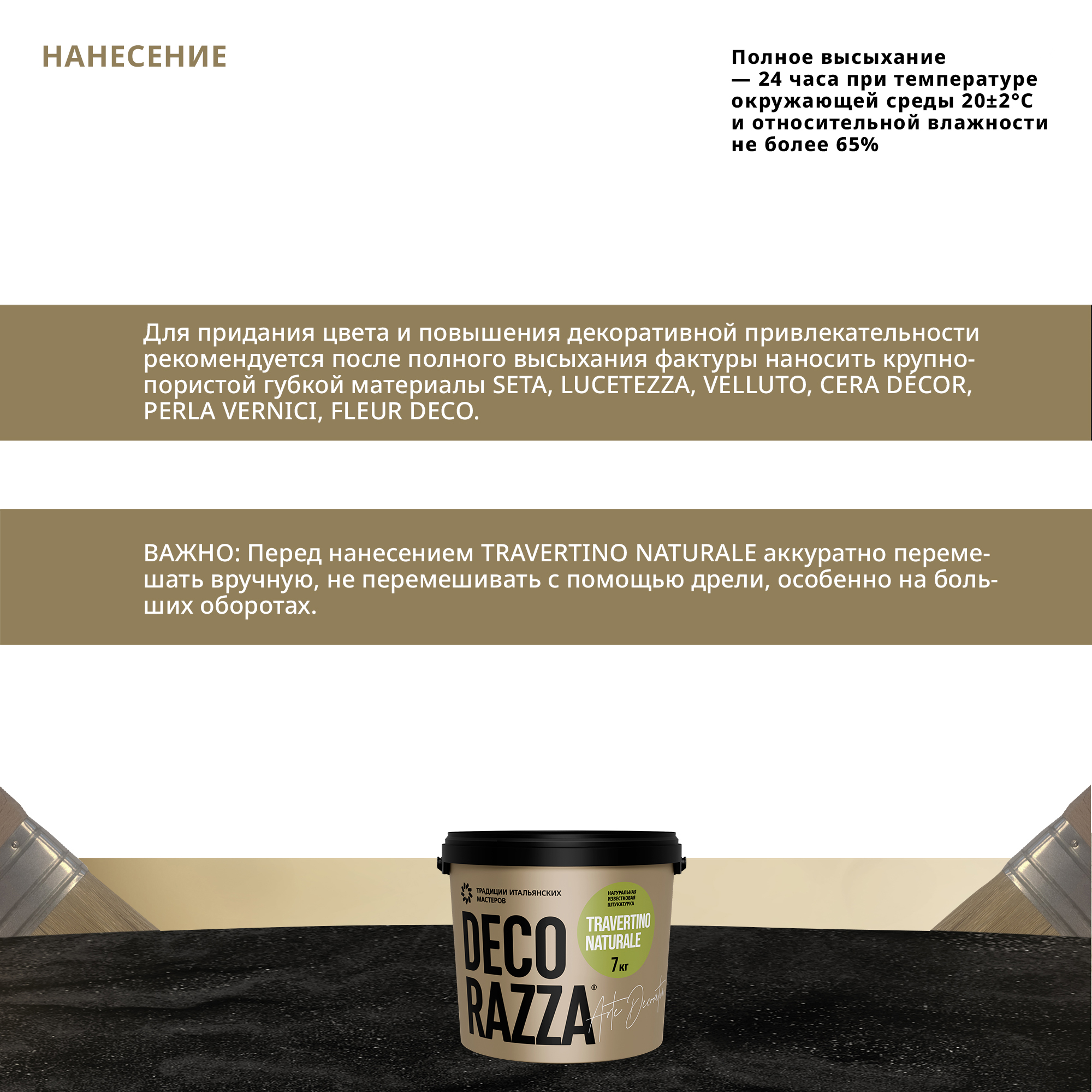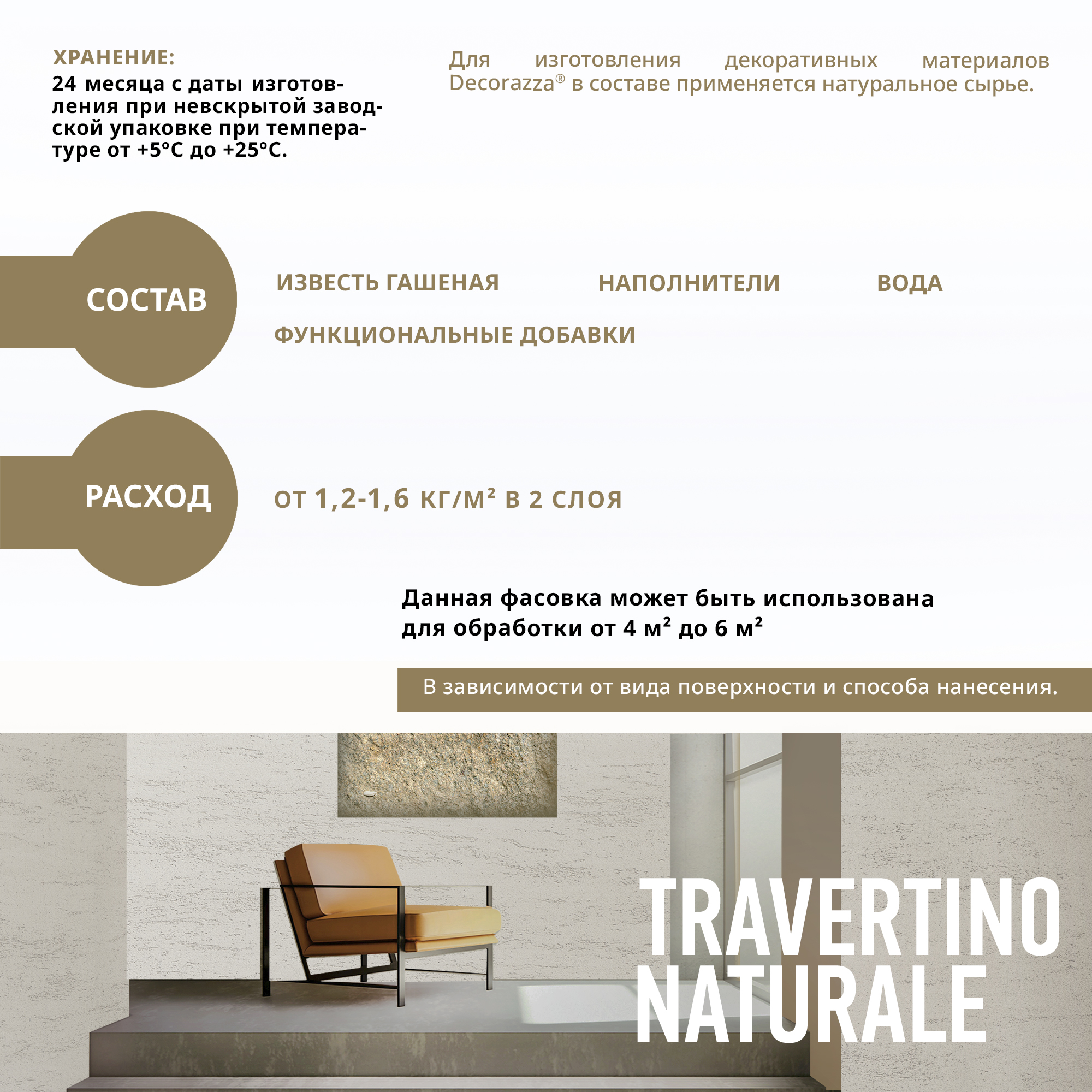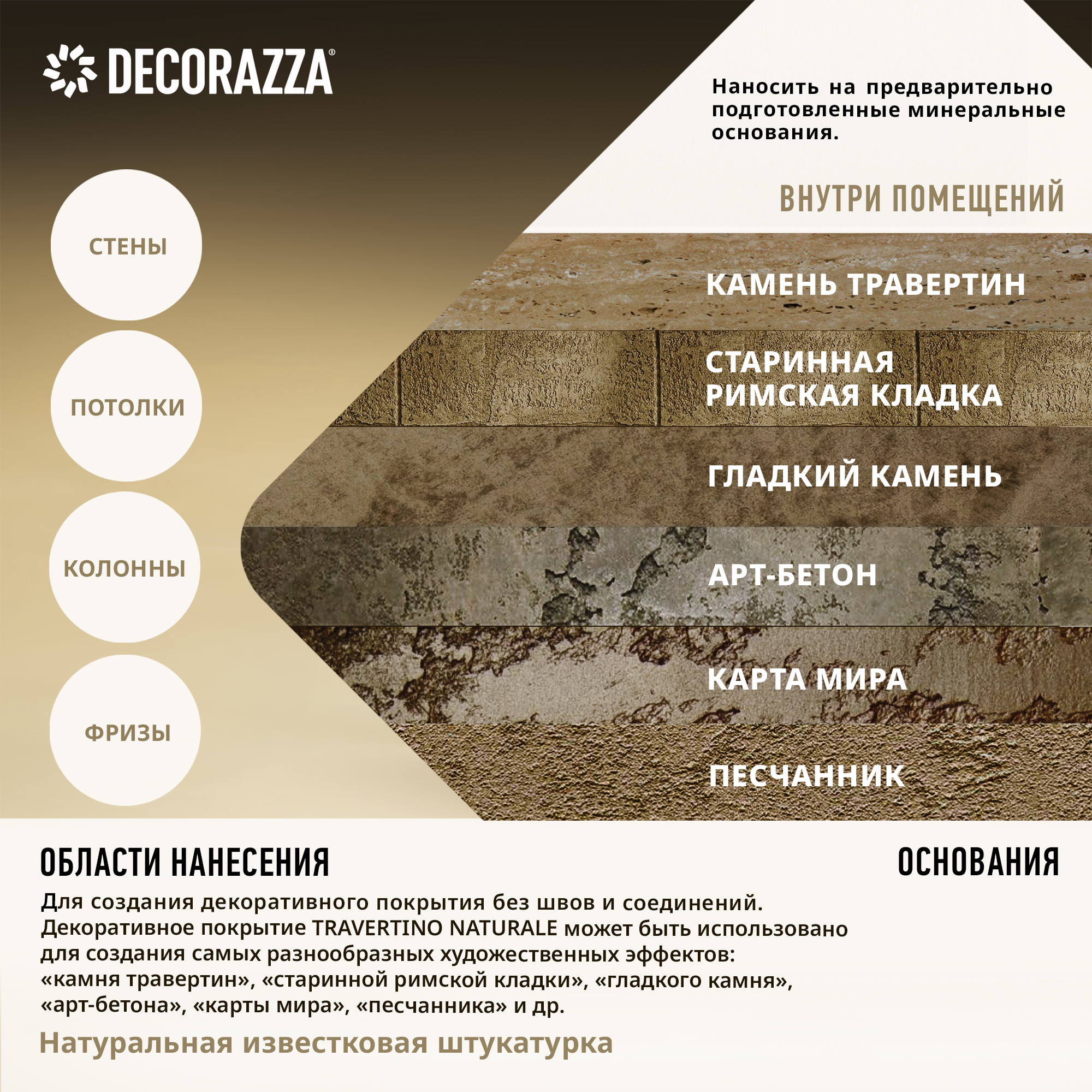 От официального дилера в Тольятти предлагаем Декоративное покрытие Travertino naturale - Декоративное покрытие Travertino naturale для создания самых разнообразных художественных эффектов: «камня травертин», «старинной римской кладки», «гладкого камня», «арт- бетона», «карты мира», «песчанника» и др. от бренда: Decorazza