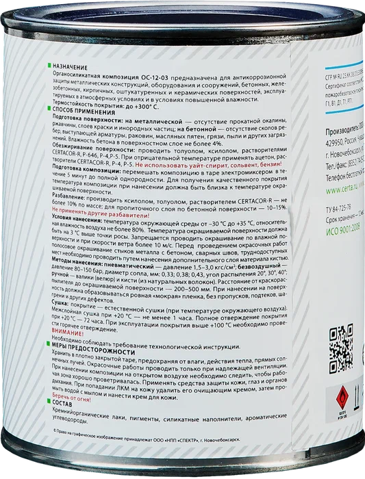 Термостойкость до +300 °CОрганосиликатная композиция ОС-12-03 CERTA — грунт-эмаль, которая защищает металл, бетон, железобетон, арматуру, кирпич, цемент, штукатурку.