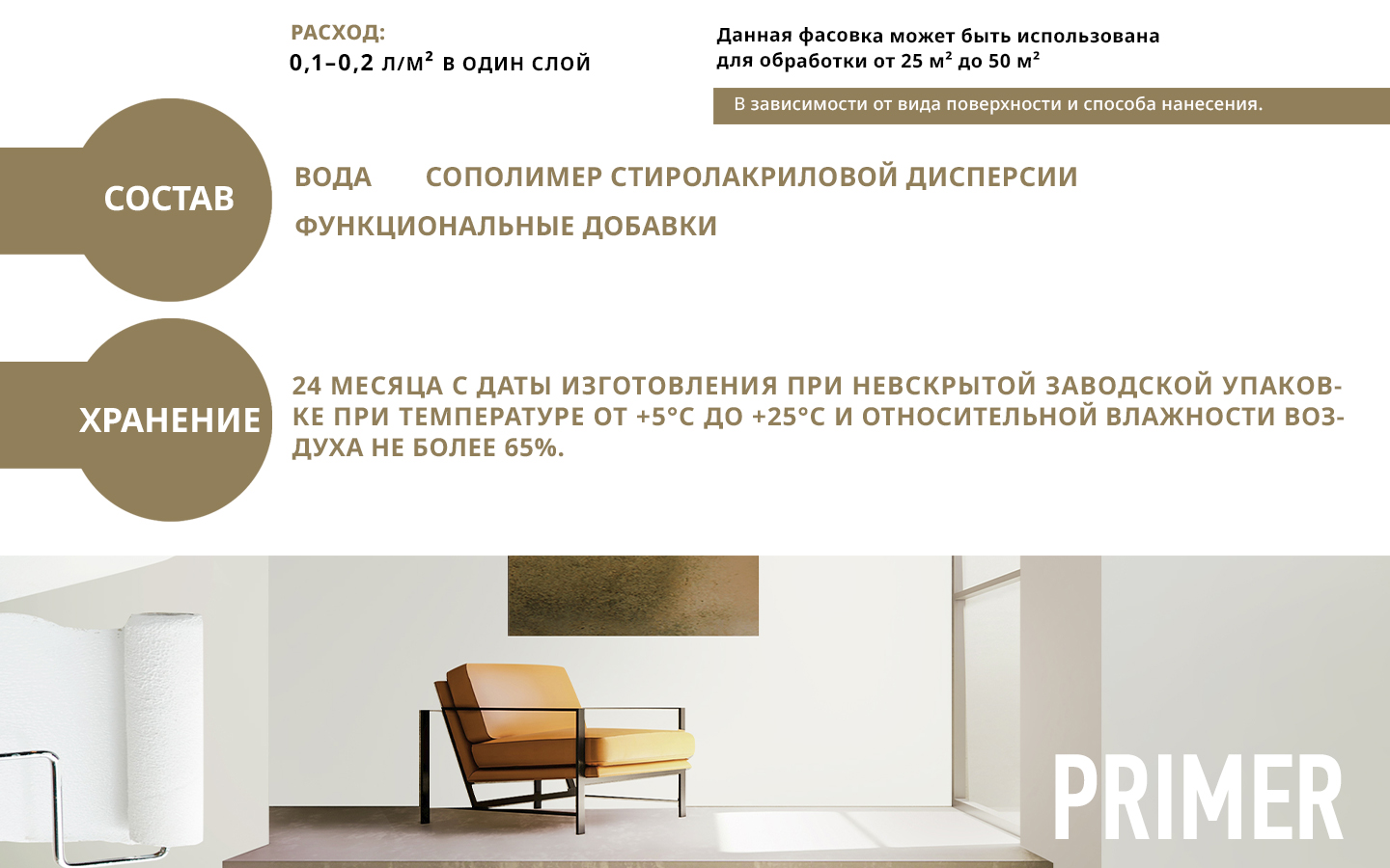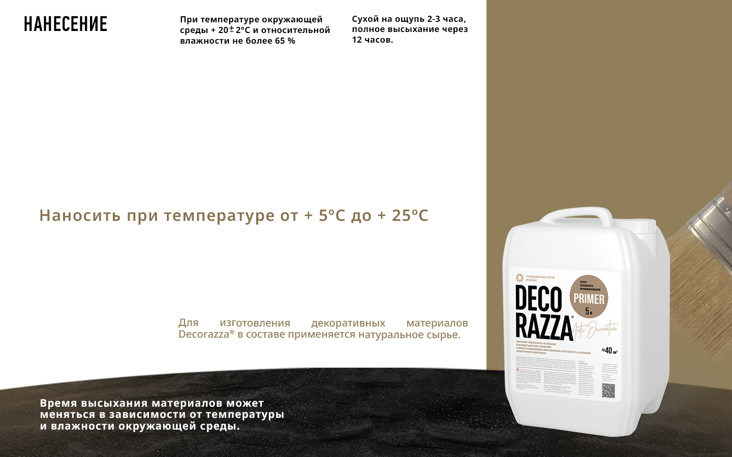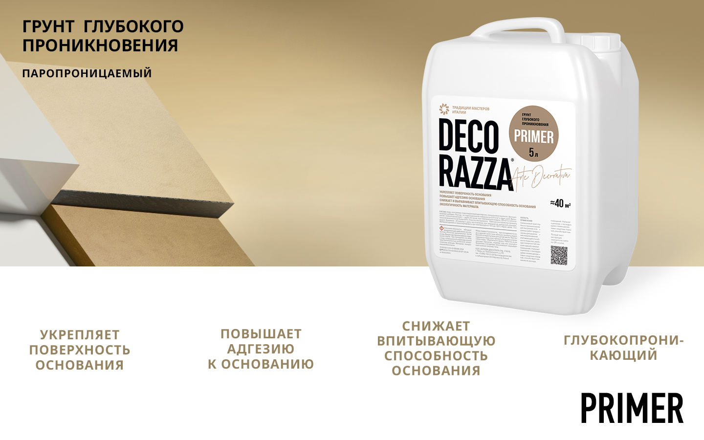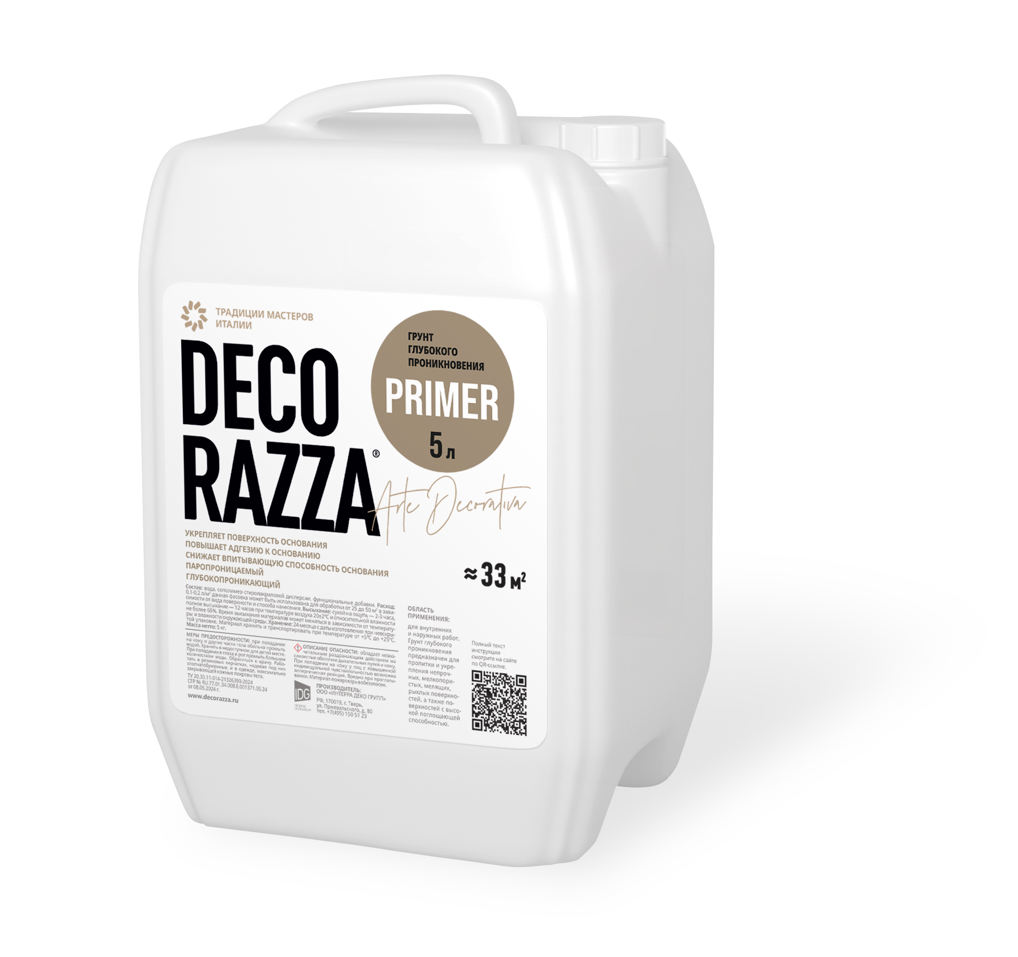От официального дилера в Тольятти предлагаем Грунт глубокого проникновения PRIMER - Грунт глубокого проникновения Decorazza PRIMER Decorazza PRIMER — это высококачественный акриловый грунт, специально разработанный для минеральных поверхностей, таких как бетон, кирпич и штукатурка. Этот уникальный грунт обладает способностью глубоко проникать в поры материала, обеспечивая надежное сцепление и долговечность последующих декоративных покрытий. Благодаря своей формуле глубокого проникновения, Decorazza PRIMER укрепляет поверхность, предотвращая образование трещин и отслоение. Он абсолютно без запаха, что делает его идеальным выбором для использования в закрытых пространствах. Благодаря своим укрепляющим свойствам, этот грунт обеспечивает превосходную адгезию и устойчивость к влаге, обеспечивая безупречный результат при нанесении любых декоративных красок и текстурных покрытий. Используйте Decorazza PRIMER для создания прочного основания, которое обеспечит непревзойденное качество и долговечность ваших декоративных проектов. от бренда: Decorazza