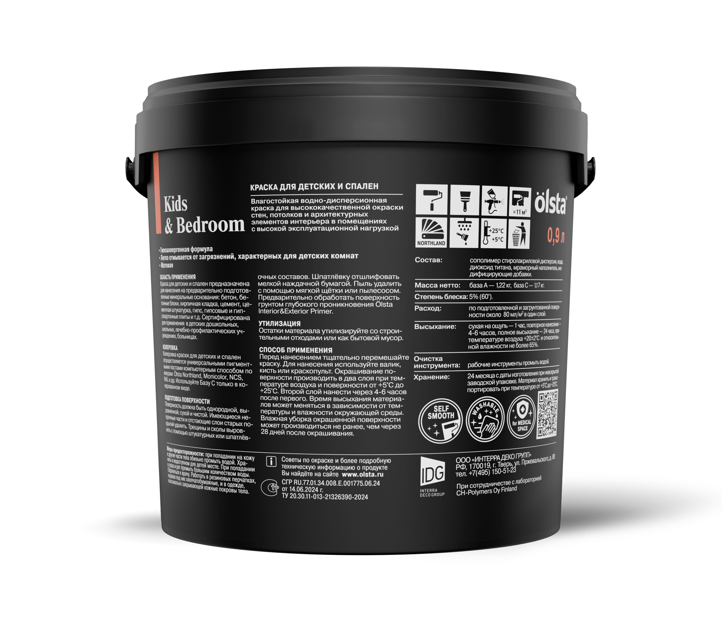 Матовая краска Olsta Kids & Bedroom разработана специально для отделки детских и спален. Состав на основе водной дисперсии акрилового полимера отличается гипоаллергенной формулой, формирует ровное прочное покрытие без подтеков. Поверхность легко отмывается от загрязнений мягкими чистящими средствами, не боится влажной уборки. Производится с белой и прозрачной базой для компьютерной колеровки в насыщенные оттенки по каталогу.