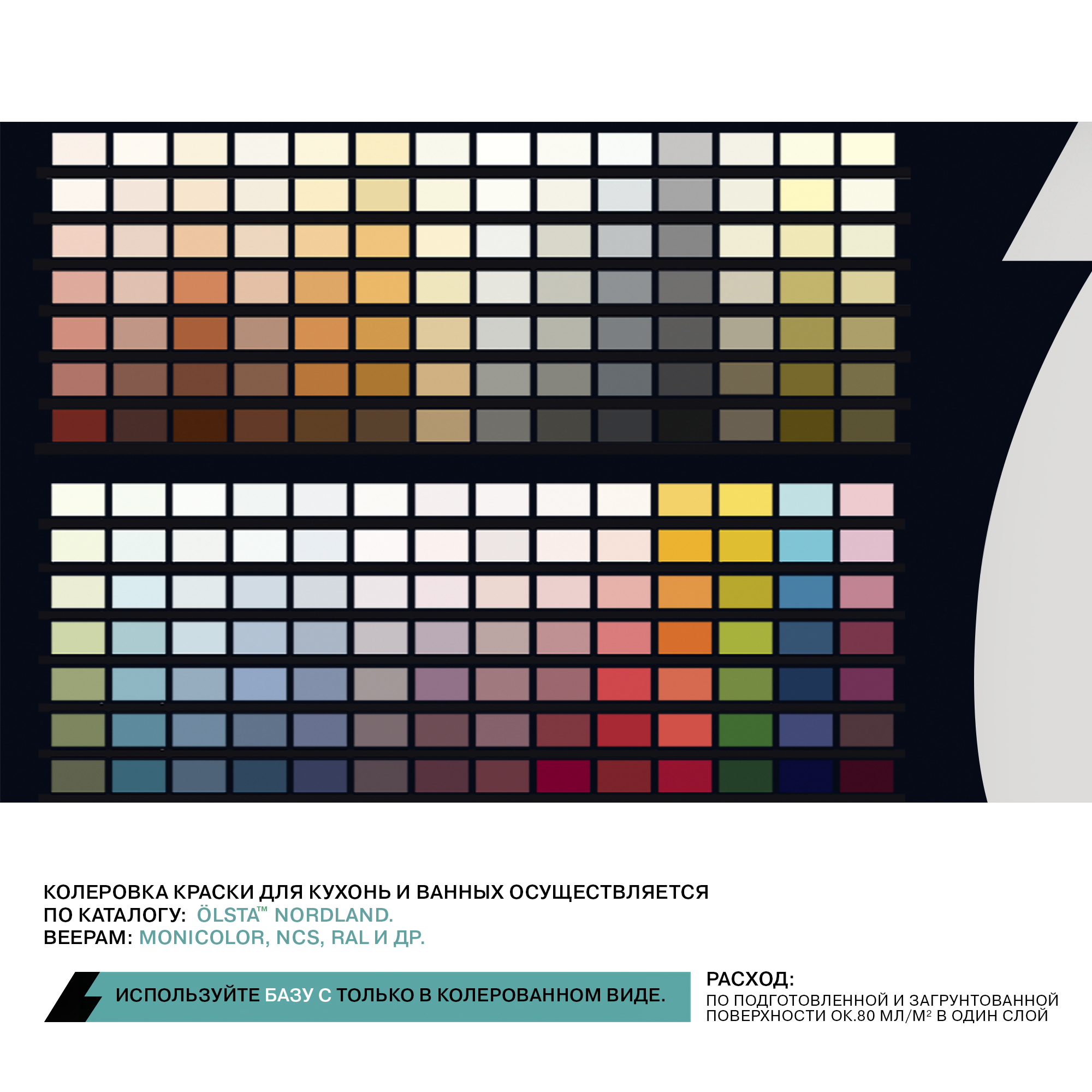 Колеровка краски для кухни и ванной осуществляется универсальными пигментными пастами компьютерным способом по веерам: Monicolor, NCS, RAL и др.