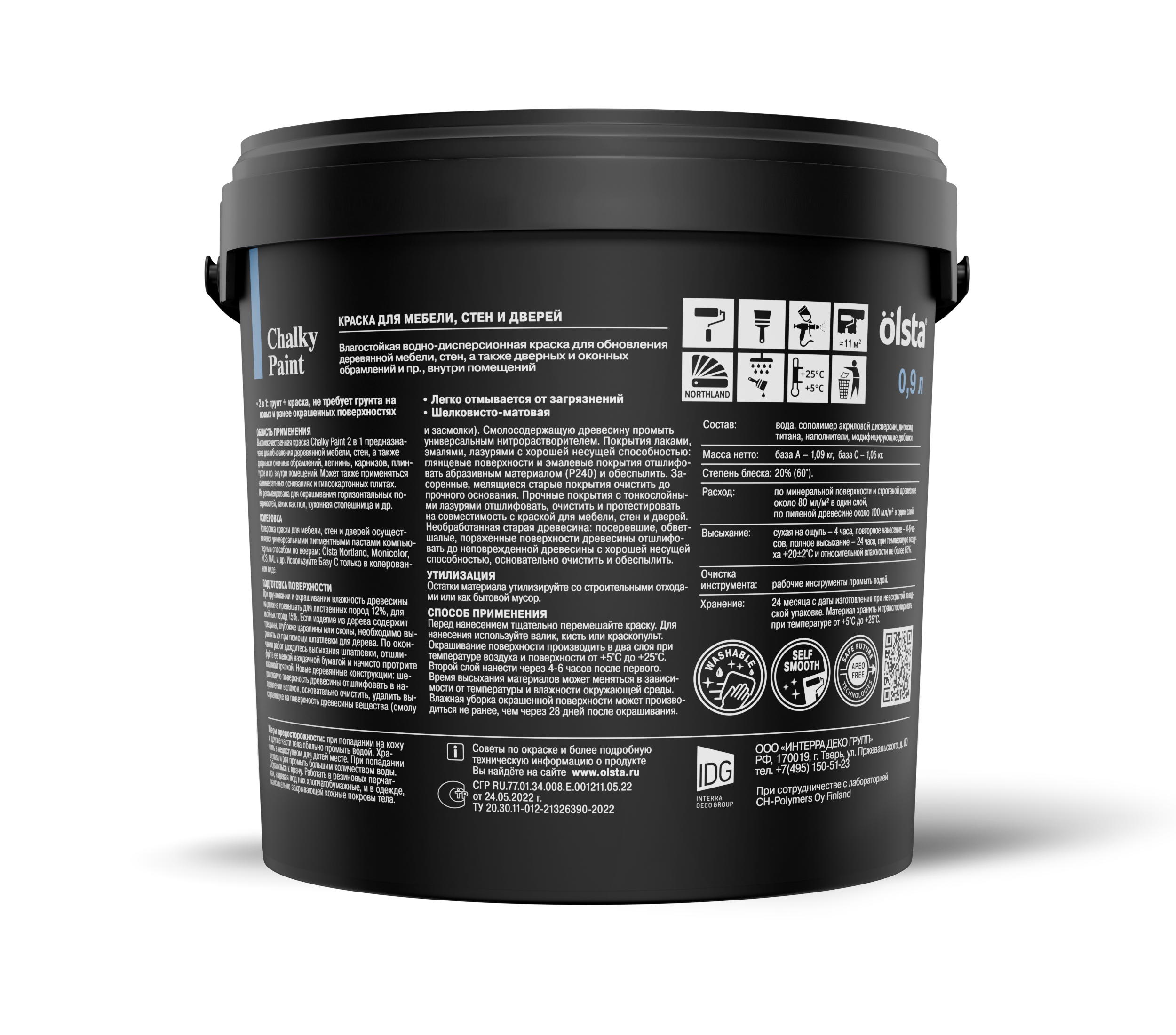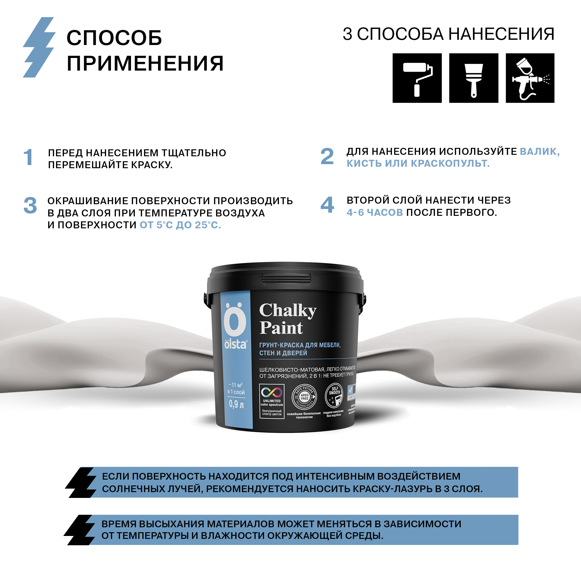 От официального дилера в Тольятти предлагаем Краска для мебели меловая CHALKY PAINT - Краска для мебели меловая OLSTA CHALKY PAINT — это идеальное решение для обновления и преображения вашего интерьера. Эта мебельная краска обладает уникальной матовой текстурой, напоминающей натуральный мел, что придает поверхности мягкость и шарм. Благодаря своей стойкости, она надежно защищает поверхность от царапин и износа, сохраняя свежесть цвета даже после многократного использования. OLSTA CHALKY PAINT отличается экологичностью и безопасностью благодаря водной основе, полностью исключающей неприятный запах, характерный для традиционных красок. Это делает её идеальным выбором для работы в закрытых помещениях или с детьми. Одним из главных преимуществ данной краски является возможность колорирования — вы можете создать абсолютно любой оттенок по своему вкусу, используя специальные колеры от производителя. Это открывает широкие творческие возможности для дизайна и декорирования мебели, обеспечивая индивидуальность и уникальность каждого проекта. Выбирая OLSTA CHALKY PAINT, вы получаете не просто краску, а инструмент для создания неповторимого стиля в вашем доме. от бренда: OLSTA