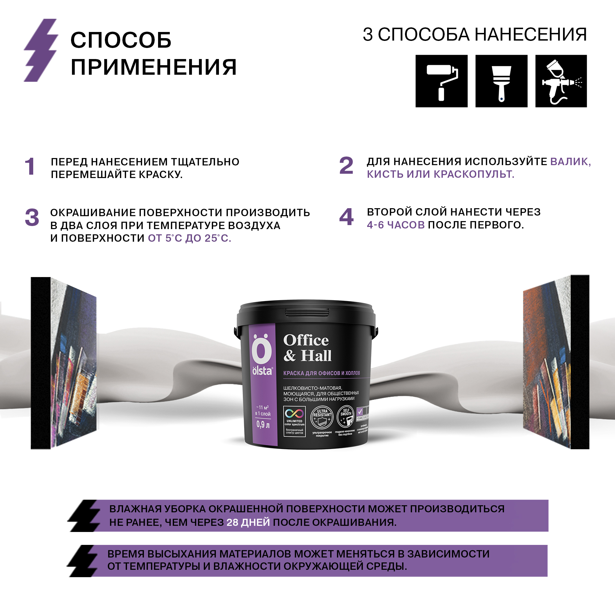 Изготовленная по особой технологии с повышенным количеством акрилового связующего краска Olsta Office & Hall обеспечивает высококачественное окрашивание стен в вестибюлях, офисах, холлах и на других объектах, предполагающих высокую эксплуатационную нагрузку. Материал создает матовое влагостойкое покрытие, отличающееся паропроницаемостью, простотой ухода, устойчивостью к мытью и истиранию.