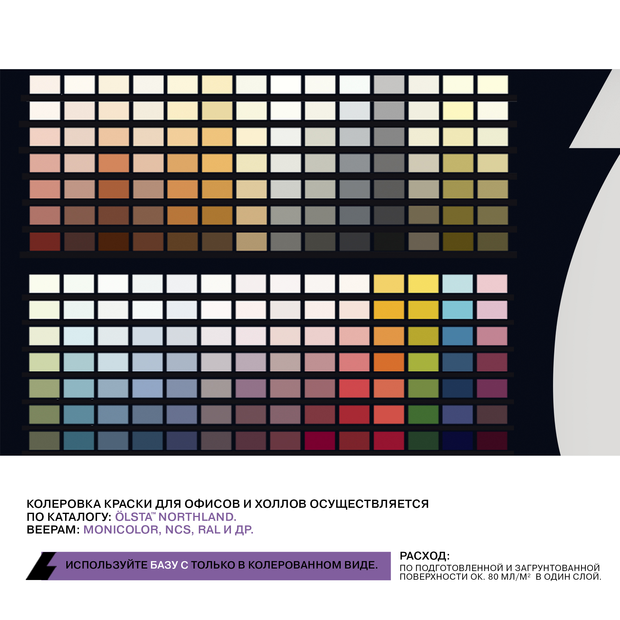 Цвета: | Белый; Основа C - для колеровки в насыщенные тона, компьютерная колеровка по согласованию. |