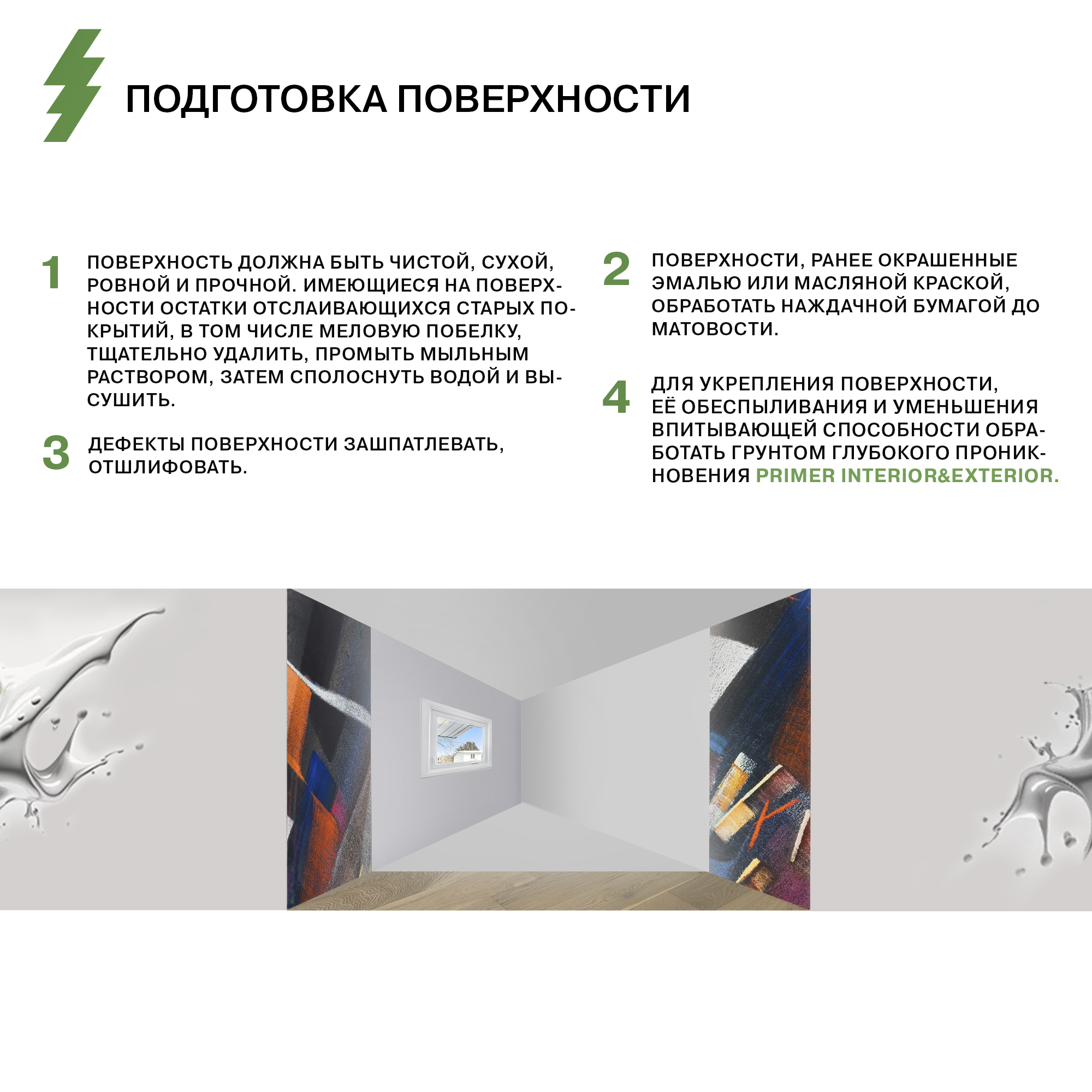 Поверхность должна быть чистой, сухой, ровной и прочной. Имеющиеся на поверхности остатки отслаивающихся старых покрытий, в том числе меловую побелку, тщательно удалить. Промыть мыльным раствором, затем сполоснуть водой и высушить. Поверхности, ранее окрашенные эмалью или масляной краской, обработать наждачной бумагой до матовости. Дефекты поверхности зашпатлевать, отшлифовать. Для укрепления поверхности, её обеспыливания и уменьшения впитывающей способности обработать грунтом глубокого проникновения Olsta Interior&Exterior Primer.