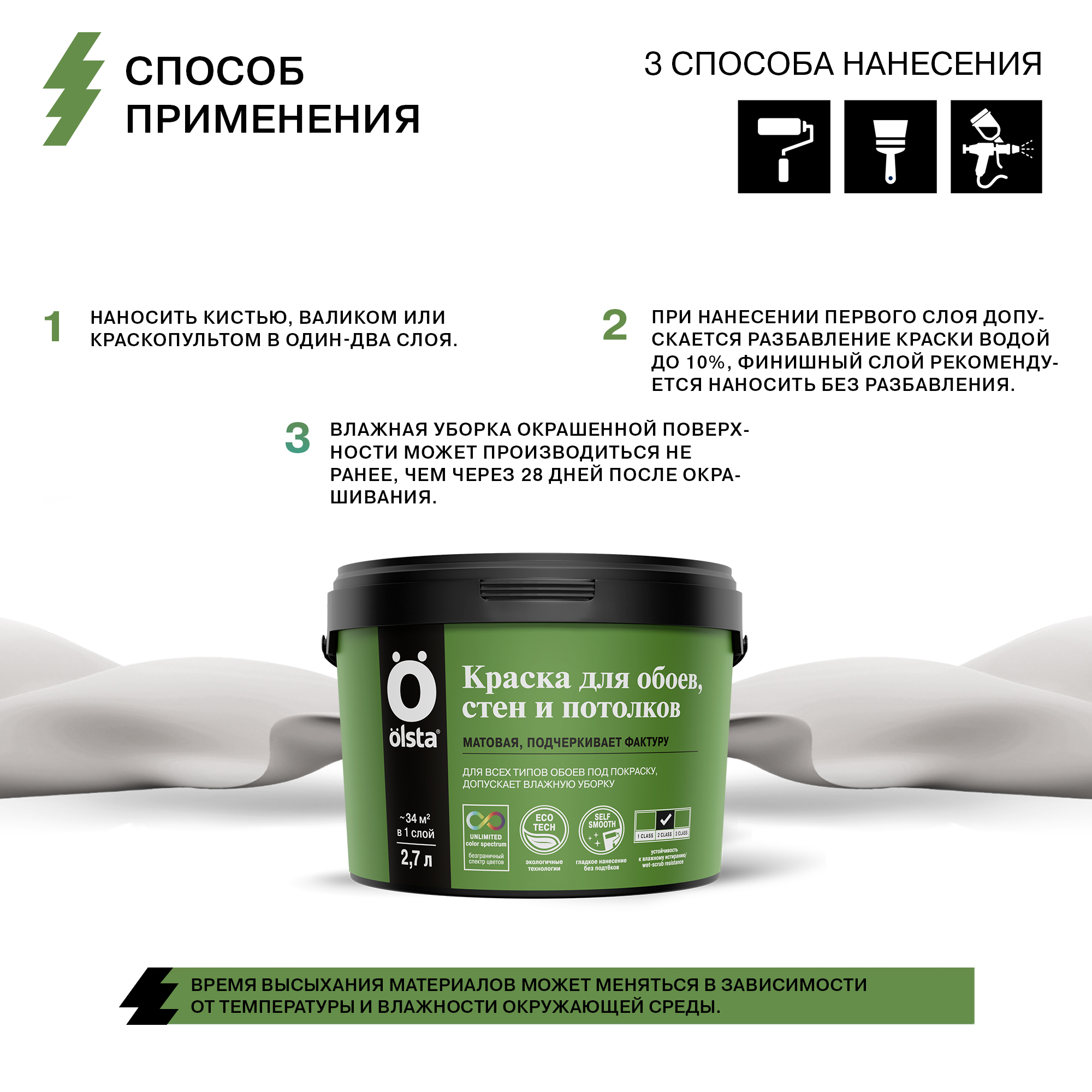 Для постоянных клиентов действует система клубных карт и специальные условия сотрудничества. Если по какой-то причине Вас не устроит цена на товар Краска для стен, обоев и потолков OLSTA, мы постараемся сделать максимальную скидку, либо предложить наилучший вариант для аналогичного результатаФасовка: | 0,9 л; 2,7 л; 9 л |