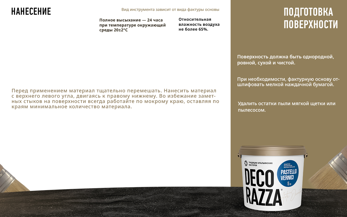 Поверхность должна быть прочной, чистой, сухой и обезжиренной. При необходимости, фактурную основу отшлифовать мелкой наждачной бумагой. Удалить остатки пыли мягкой щеткой или пылесосом.