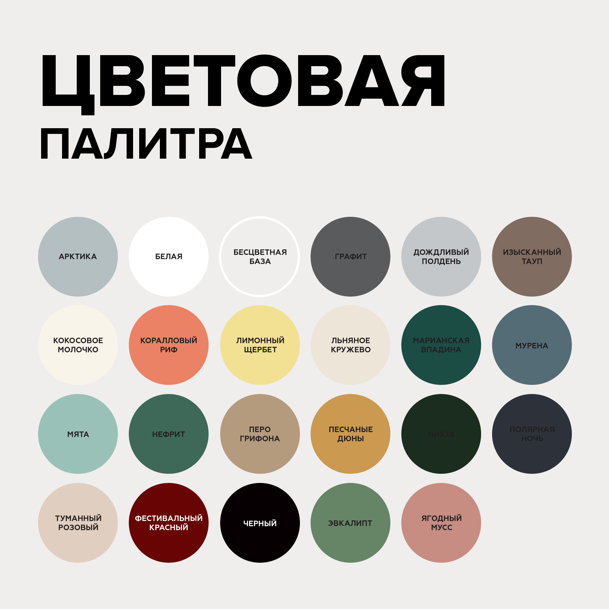 Цвета: | Арктика; Белый; Графит; Дождливый полдень; Изысканный тауп; Кокосовое молочко; Коралловый риф; Лимонный щербет; Льняное кружево; Марианская впадина; Мурена; Мята; Нефрит; Основа C - для колеровки в насыщенные тона; Перо грифона; Песчаные дюны; Пихта; Полярная ночь; Туманный розовый; Фестивальный красный; Черный; Эвкалипт; Ягодный мусс , компьютерная колеровка по согласованию. |