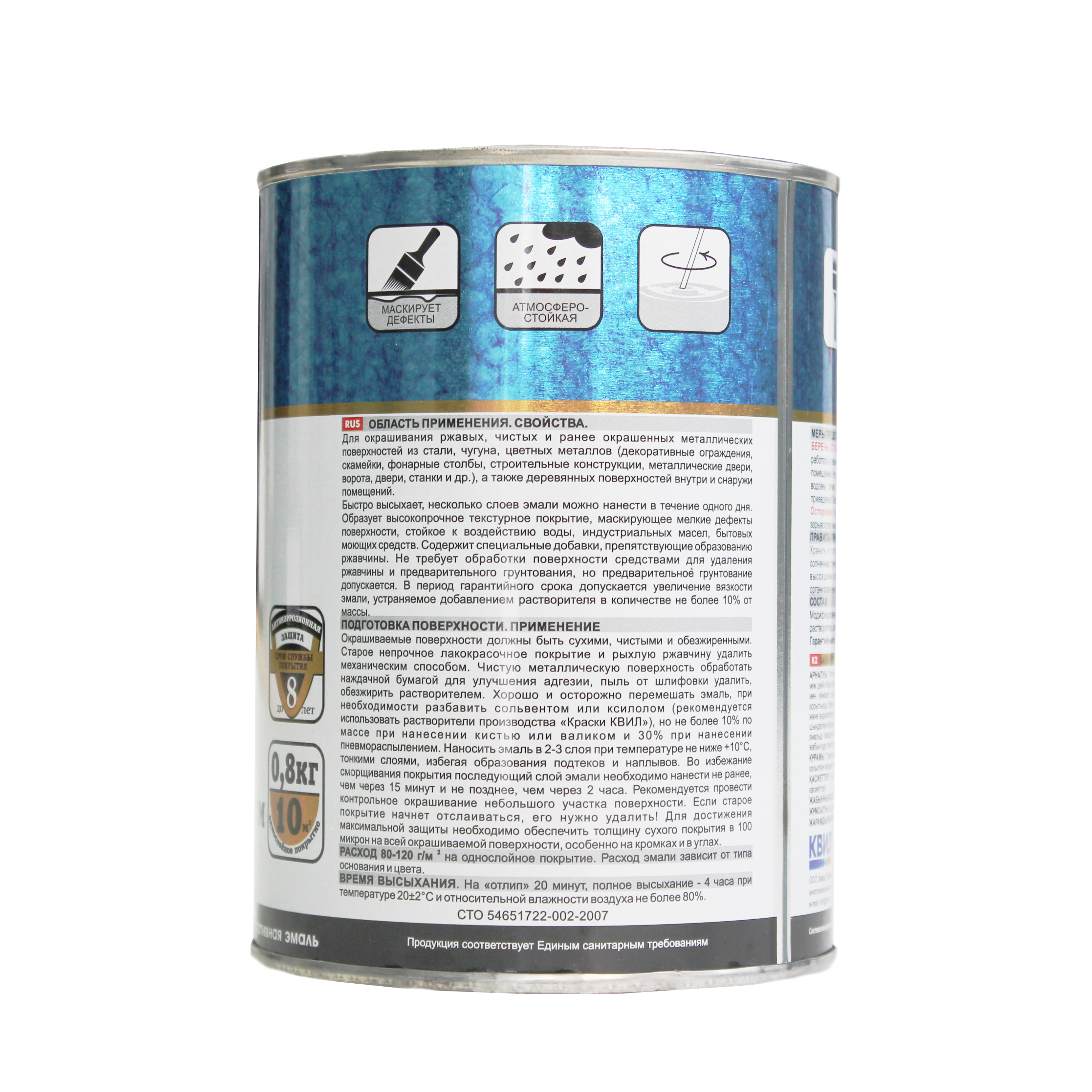 Быстро высыхает. Образует рисунчатое (молотковое) покрытие, маскирующее мелкие дефекты поверхности. Своеобразный фактурный рисунок подчеркивает красоту изделий ручной работы. Покрытие обладает высокой атмосферостойкостью, повышенной влаго- и противокоррозионной стойкостью. Применение эмали значительно упрощает подготовку поверхности перед окрашиванием и удешевляет технологию создания |