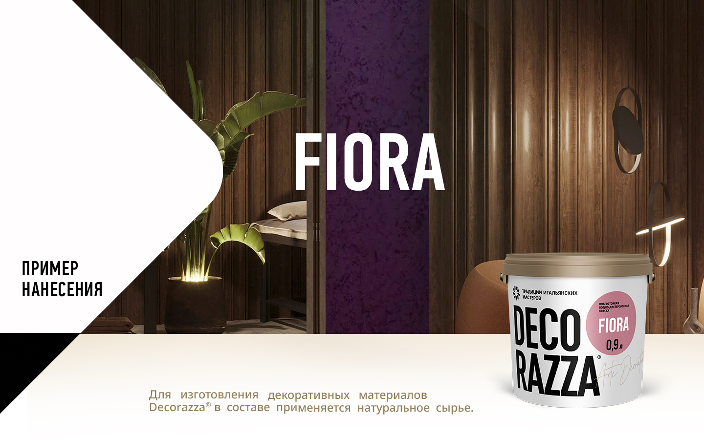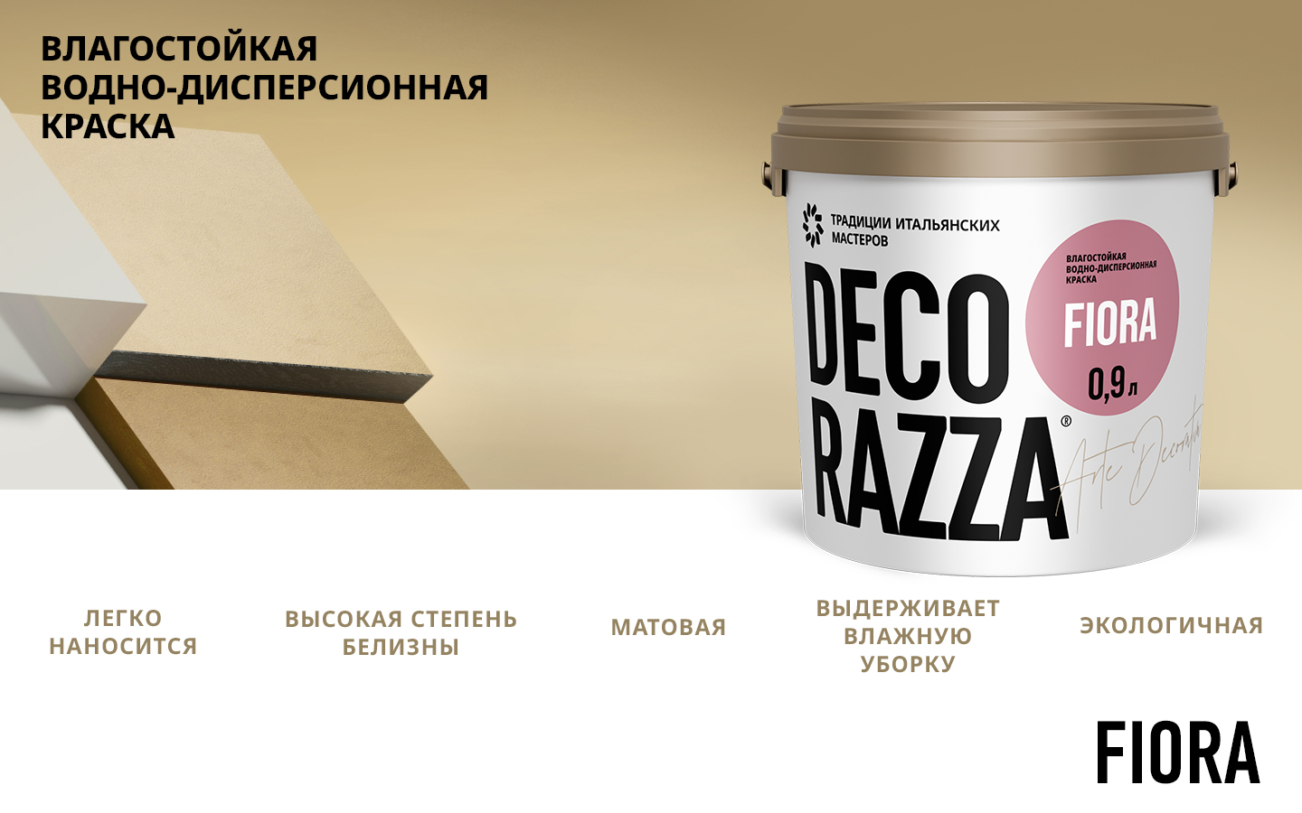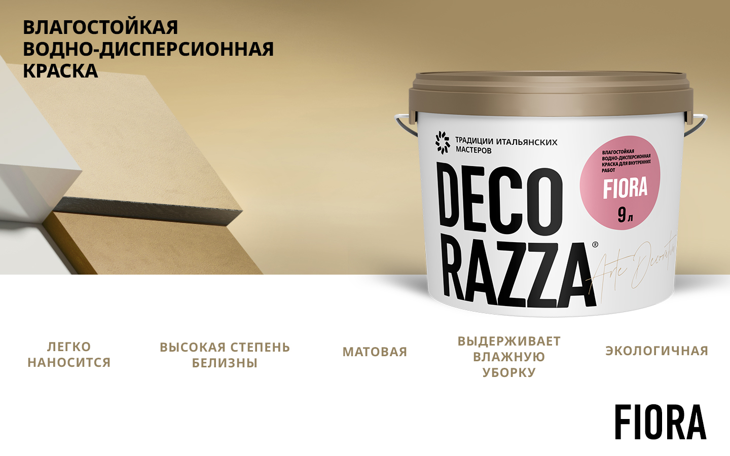 От официального дилера в Тольятти предлагаем Влагостойкая интерьерная краска FIORA - Моющаяся водно-дисперсионная интерьерная краска для стен и потолков в помещениях, требующих частой уборки от бренда: Decorazza