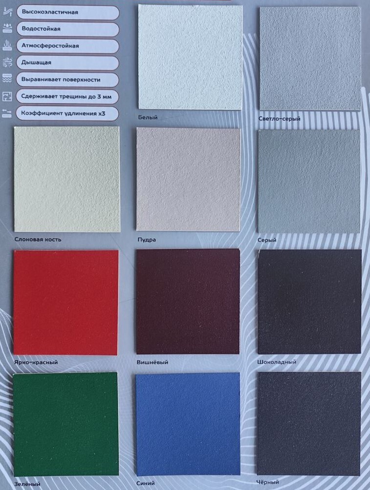 Высококачественная толстослойная краска для наружных и внутренних работ. Обладает высокой эластичностью, водо- и атмосферостойкостью.